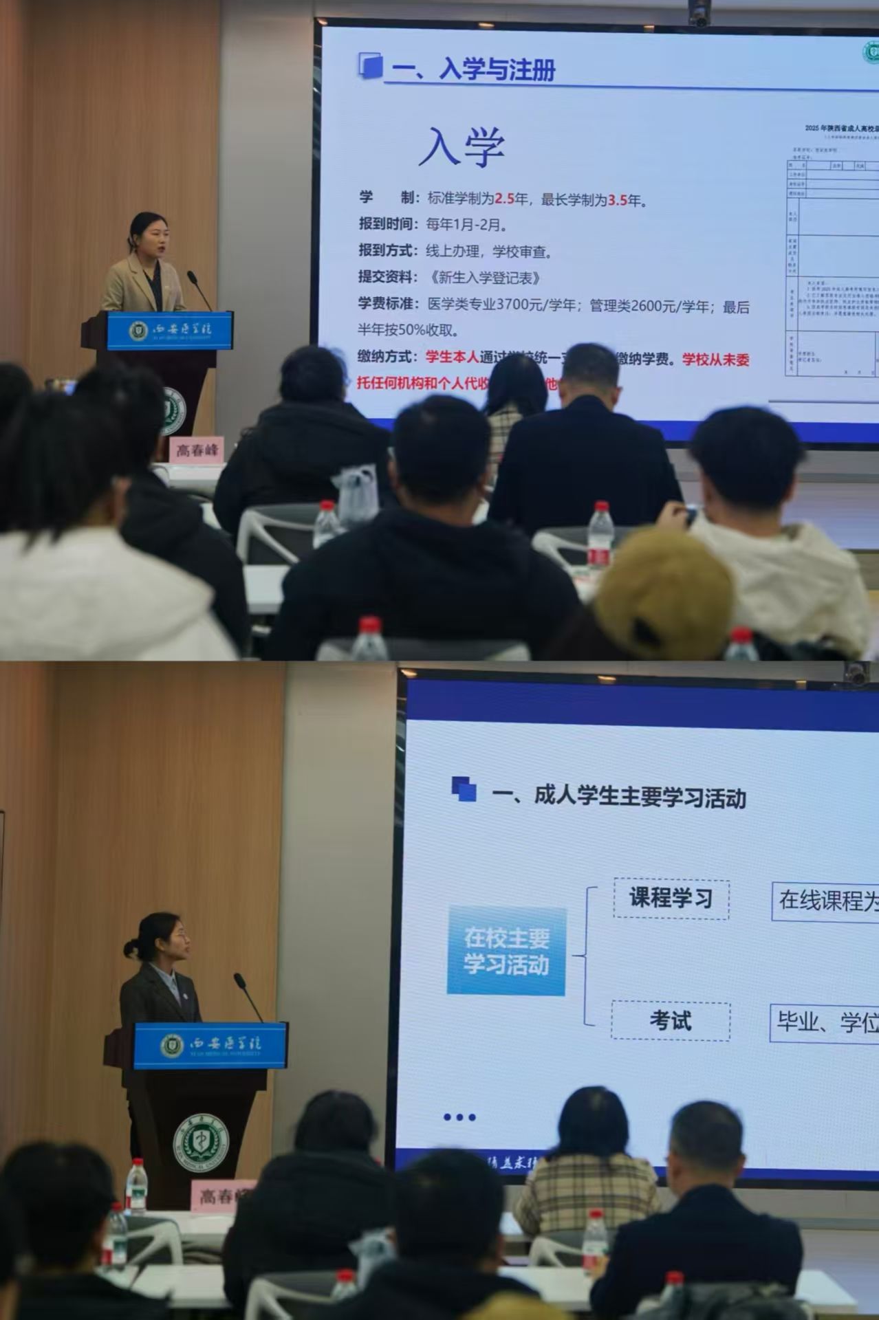 随后,为帮助同学们更好地了解学院学籍管理、学位、考试等相关内容,继续教育学院招生工作部薛妮萍老师和成人学历教育部石苏老师为大家做了详细讲解。