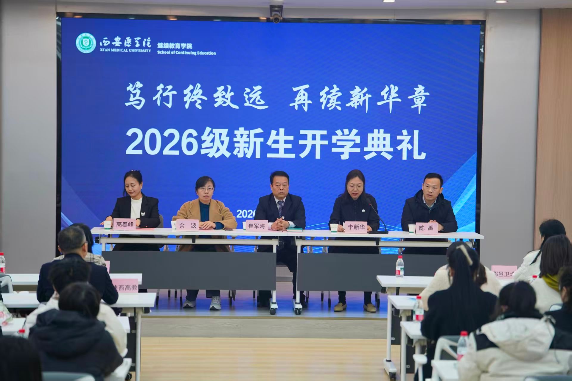 2026年3月14日上午,继续教育学院2026级新生开学典礼在高新校区六楼报告厅举行。出席典礼的领导嘉宾有:继续教育学院院长崔军海,发展规划处副处长余波,督导组组长荆亚茹,西安市鄠邑区卫生健康培训中心主任高春峰,陕西省高教系统职业中等专业学校校长陈禹。各校外教学点管理人员、继续教育学院全体教职工与2026级全体新生线上线下齐聚一堂,共同见证这一重要时刻。开学典礼采用线下线上同步直播的方式,由继续教育学院副院长李新华主持。