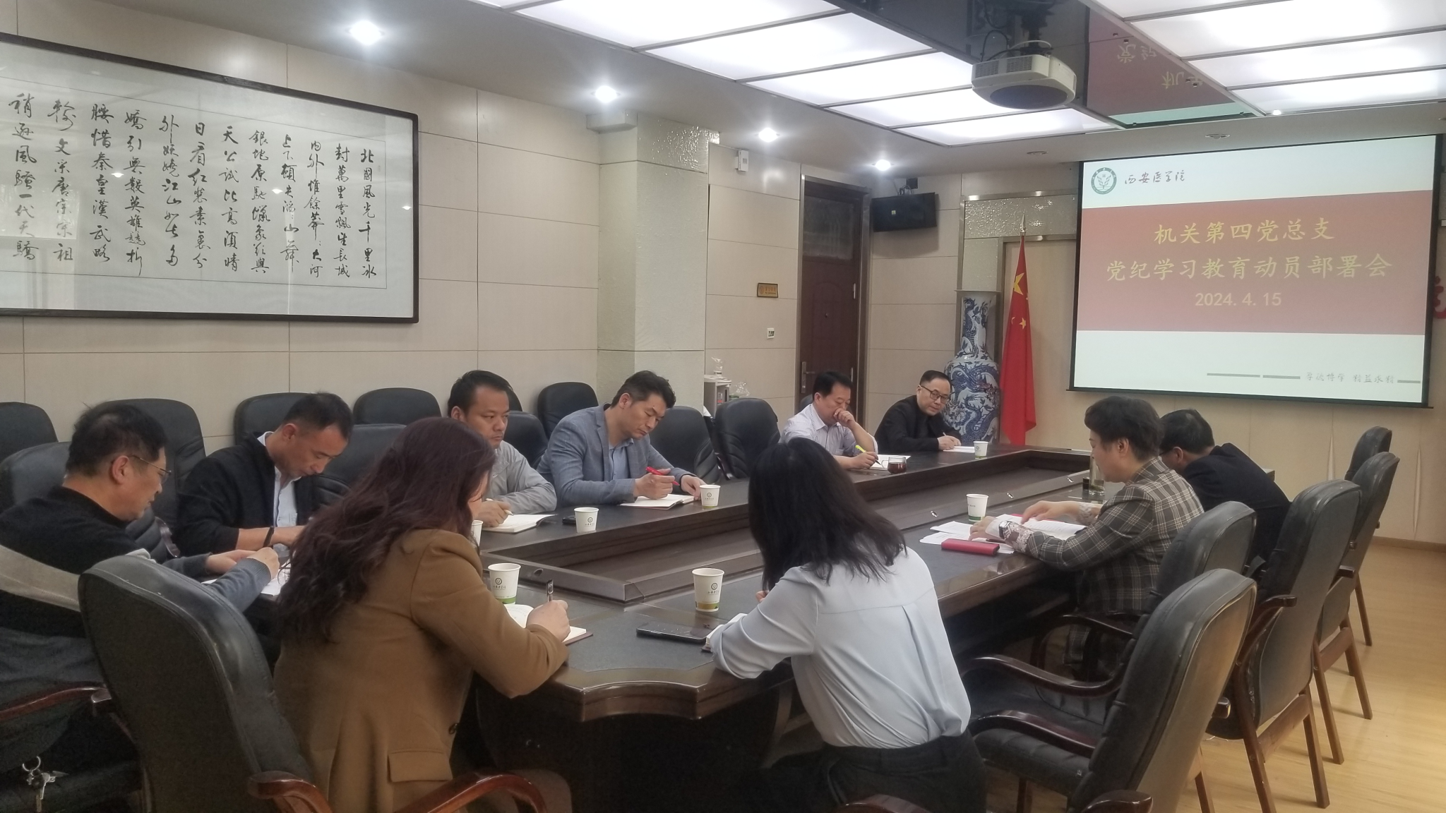 4月15日,机关四总支在高新校区会议室召开党纪学习教育动员部署会,旨在深入贯彻落实中省、学校关于党纪学习教育部署会议精神,会议由机关四总支书记靳红樱主持,机关四总支全体委员及各党支部委员参加会议。